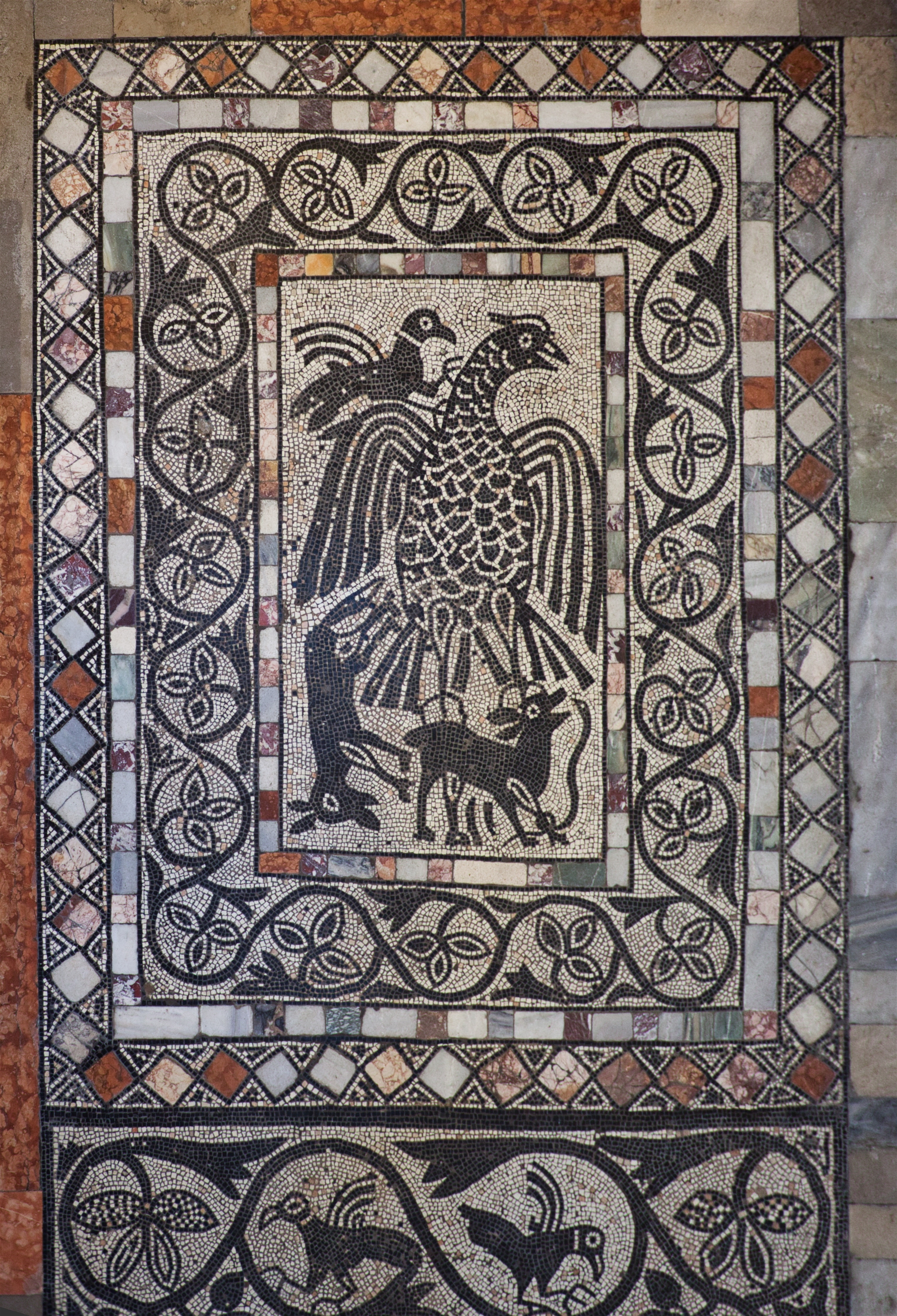 Sotto il mausoleo, i restauri di fine Ottocento hanno portato alla luce uno dei tre lacerti di un rivestimento musivo del X-XI secolo, che in origine doveva ricoprire l’intera superficie della chiesa, come un prezioso tappeto.