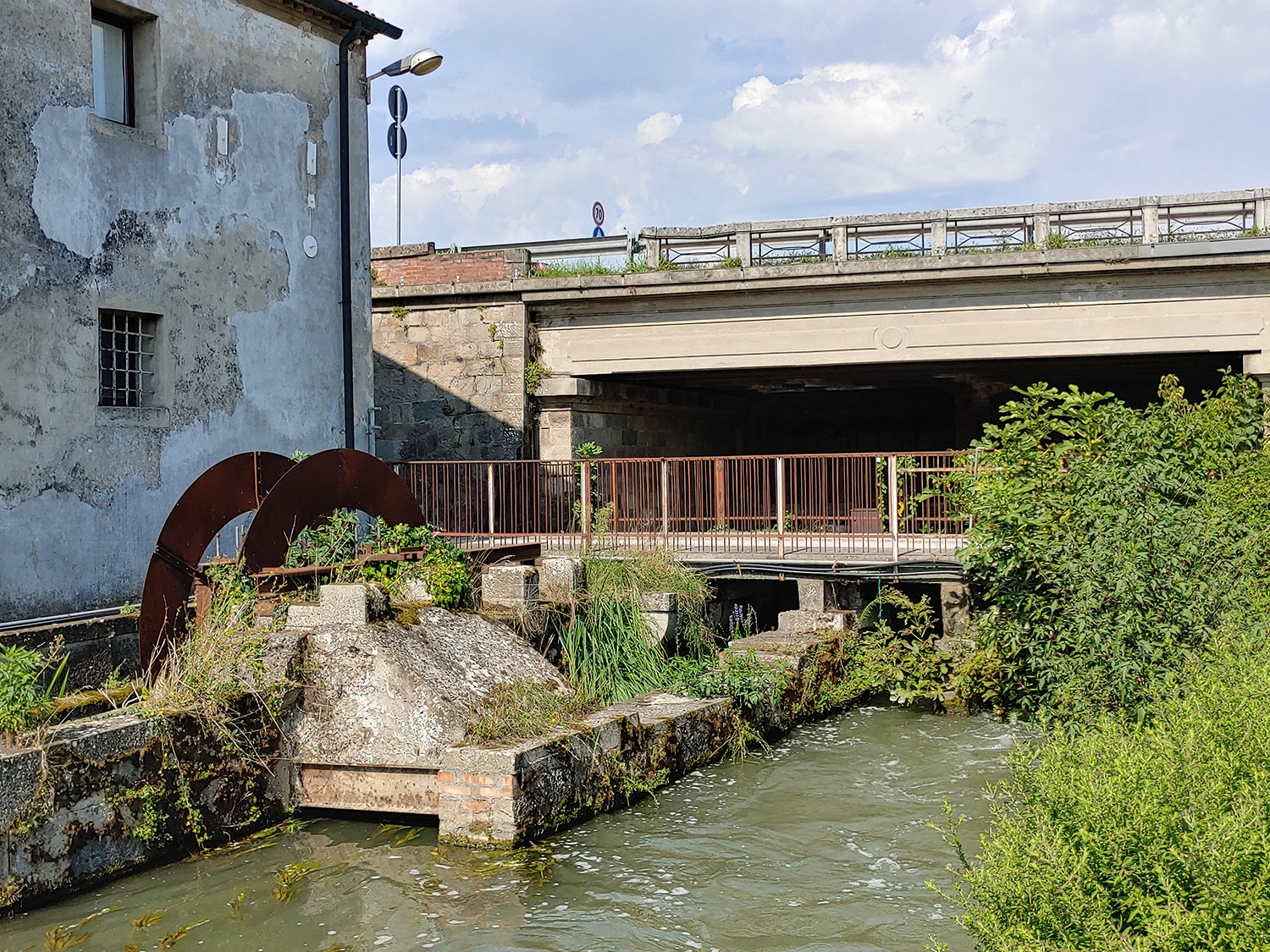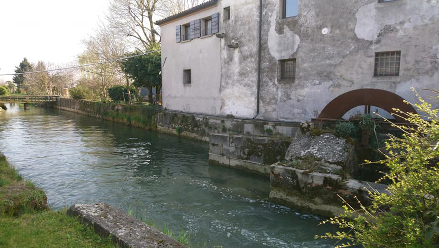 Ancora oggi sono visibili i resti dei cinque calloni (canaletti): di questi, quattro erano destinati all’attività delle otto ruote idrauliche, mentre il quinto fungeva da scarico. Si vede, inoltre, la parte del ponte a due archi in muratura sopra cui correva la vecchia strada “postale” Adriatica prima degli interventi di ampliamento. Poco lontano, ecco anche l’edificio in muratura con la ruota ricostruita che ha sostituito quelle più antiche, in legno.