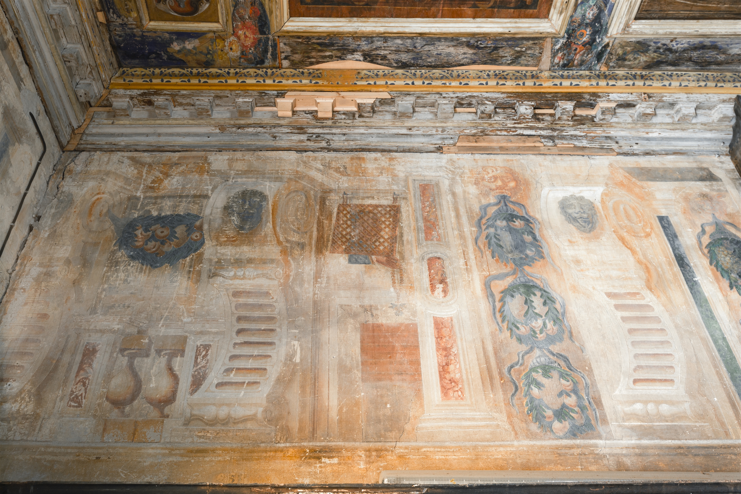 Degni di attenzione sono anche gli affreschi del 1672, realizzati dal pittore bresciano Girolamo Cellini. Le immagini compongono una fascia dipinta con motivi di finta architettura, a trompe l'oeil, che si caratterizza per una serie di brevi balaustre, intervallate da paraste di marmo rosso, medaglioni e da festoni sospesi a protomi leonine (un elemento decorativo molto diffuso nell'arte antica, costituito da una testa di leone). La decorazione termina con la cornice dentellata verso il soffitto, come volesse sorreggerlo.
