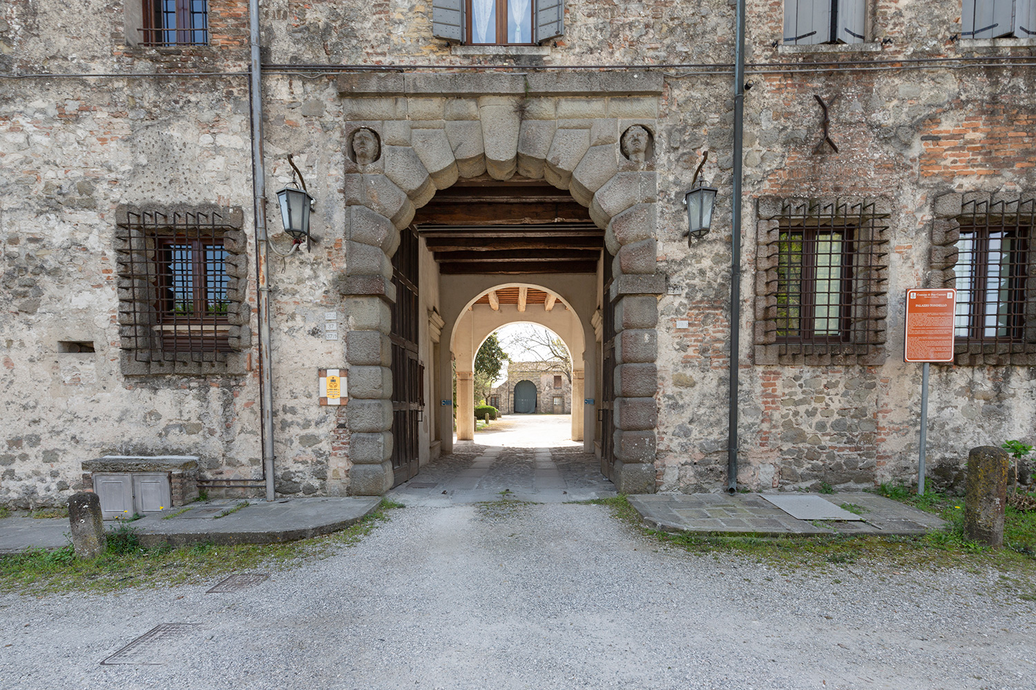 Palazzo Tondello ha un ingresso dal portale affacciato sulla via per Pontemanco e, anche se si tratta di una proprietà privata, chiedendo gentilmente di poter accedere si possono ammirare la facciata interna con la splendida loggia, i resti degli affreschi dipinti tra le travi del soffitto del portico sotto la loggia e gli altri edifici oggi adibiti a depositi.